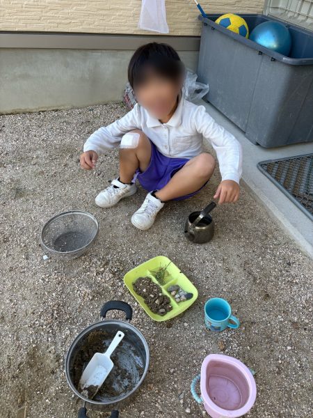 おままごとは砂をザルで振るって、やかんでお水を入れて本格的です✨