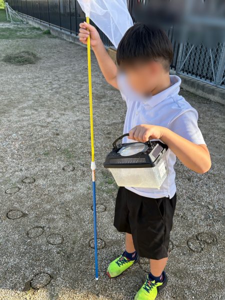 バッタを捕まえに行ったところ、外の室外機の風で虫取り網がなびくことにピーン!💡