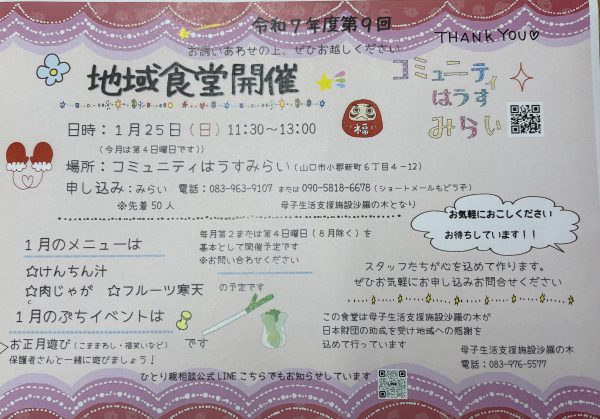 1月の地域食堂のお知らせです! お気軽にお申し込みお問い合わせください お待ちしています😄